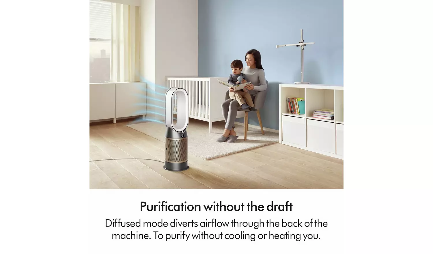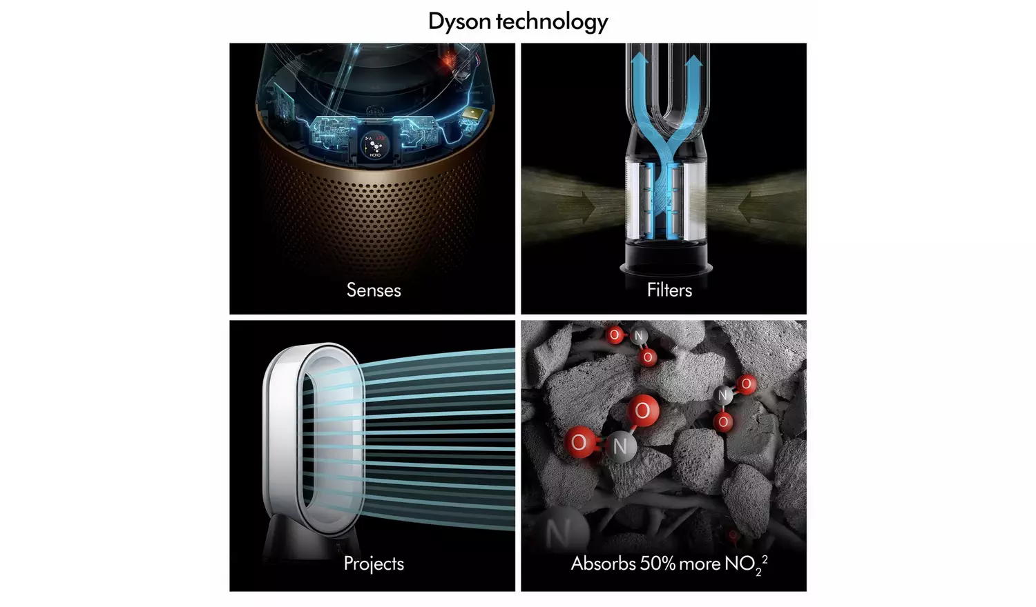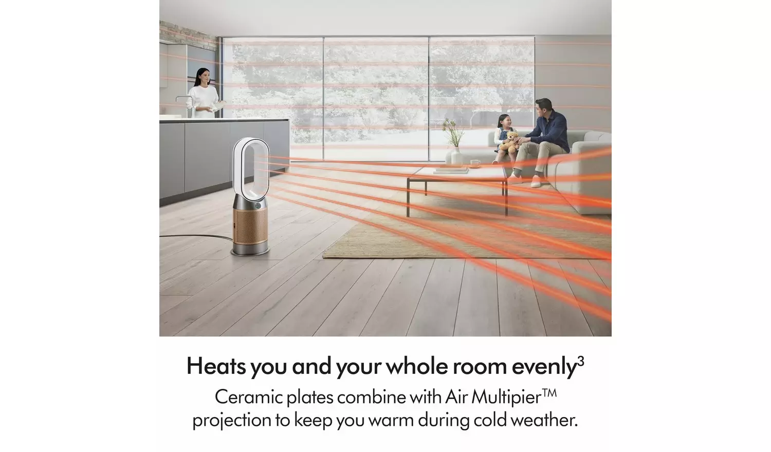 Cools you in summer. Heats you in winter. Purifies all year round. Advanced purification automatically captures 50% more NO2. Cools you quickly and quietly. Air MultiplierTM technology projects over 290 litres of air per second delivering smooth, yet powerful airflow to cool you during warmer weather. Heats you and your whole room evenly. Ceramic plates combine with Air Multiplier projection to keep you warm during cold weather. And once your target temperature is reached, heating automatically stops.