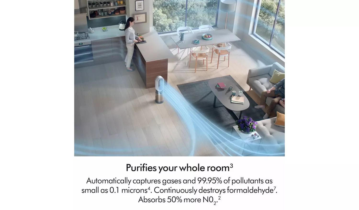 Purifies your whole room for a healthier home environment. Air Multiplier technology draws in distant pollutants including odours, ultrafine particles and gases, projecting purified air.
