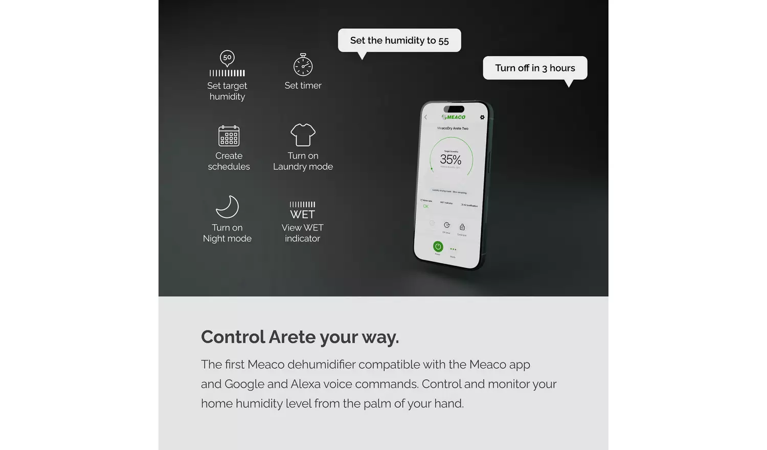 With app control, voice command compatibility (Alexa & Google), and an advanced DC motor, this unit moves up to 60% more air, making it one of the most efficient and intelligent dehumidifiers on the market.